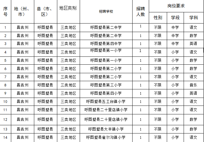 根据县人事工作领导小组审批,呼图壁县现面向社会公开招聘中小学“特岗”教师14名,其中初中教师3名,小学教师11名。现将招聘事宜公告如下: