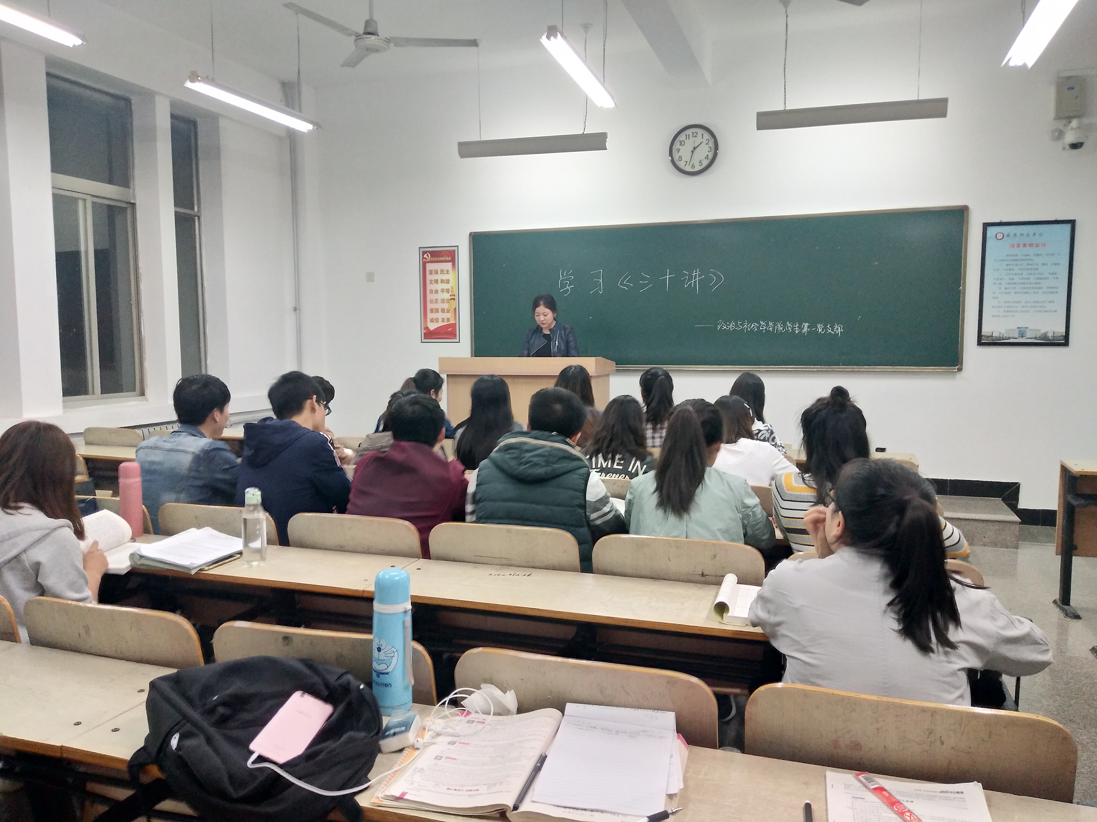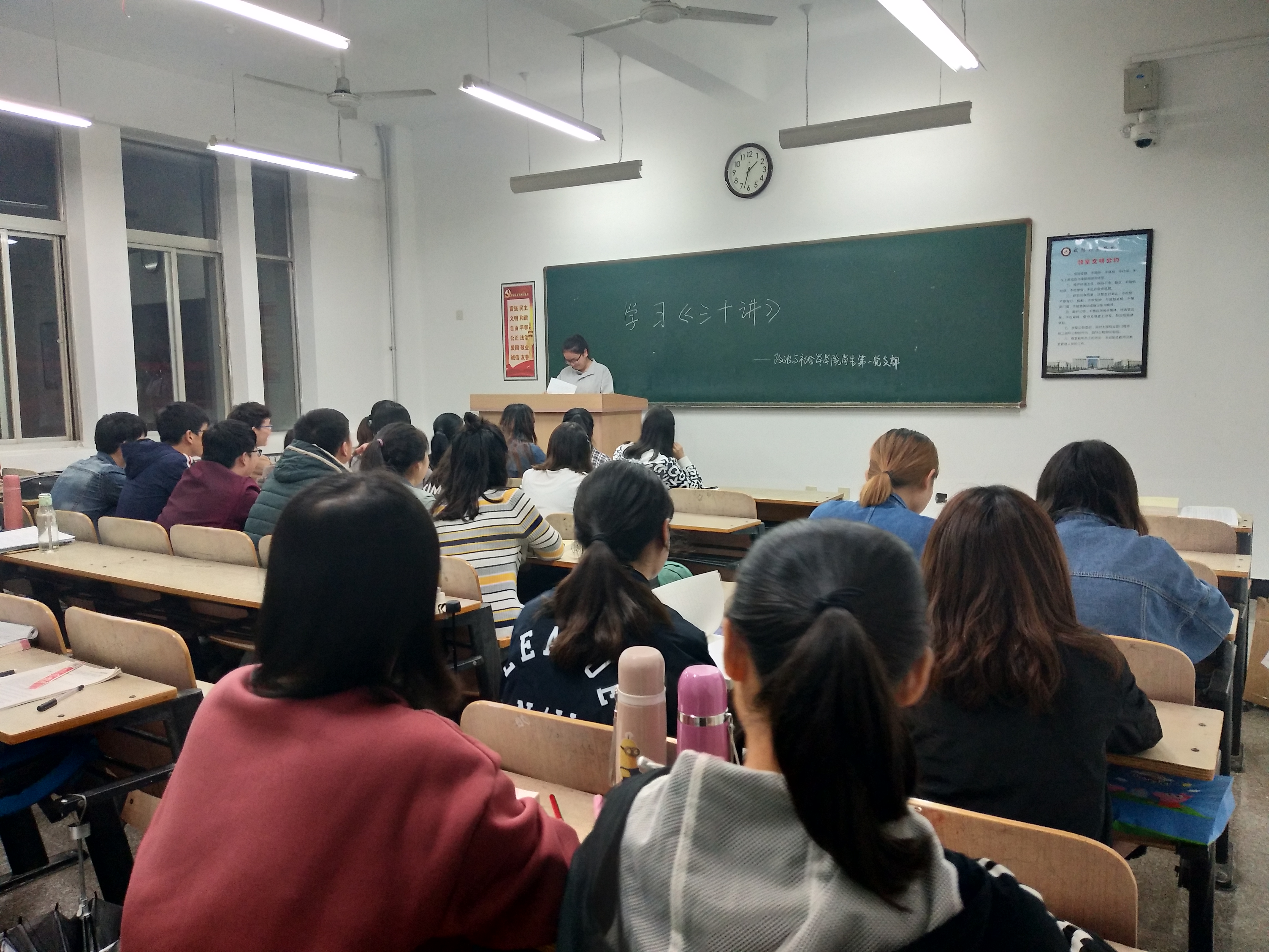 9月19日晚上七点半,政治与社会学公司院员工第一党支部在一号楼518教室开展了关于学习《习近平新时代中国特色社会主义思想三十讲》的党日活动,党支部书记贾静和全体员工党员参加了本次活动。