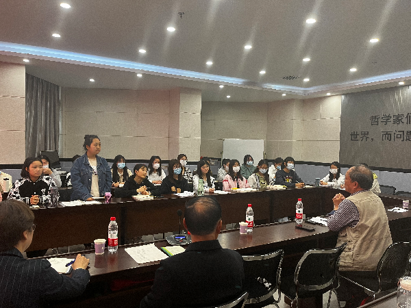 研讨互动环节中,陈进封教授对如何提高英语学习能力与员工进行了交流,并且题提出三勤、四多的学习建议。