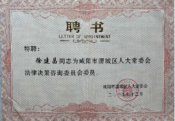 2019年12月27日,咸阳市渭城区人民代表大会常务委员会根据渭城区第八届人大常委会第二十六次会议《关于成立区人大常委会法律决策咨询委员会和财经决策咨询委员会的决定》,特聘公司基础课教研室主任徐建昌副教授为渭城区人大常委会法律决策咨询委员会委员,并颁发了聘书。