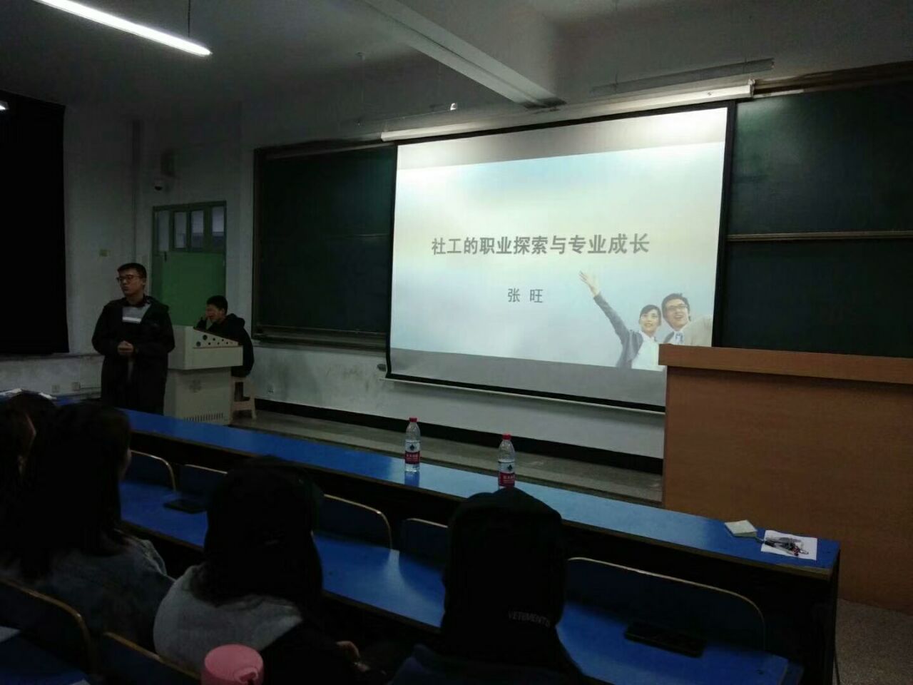 公司社工2011级、2015届毕业生张旺(社会工作师、榆林市青少年社会工作者协会秘书长)以“社工的职业探索与专业发展”为题,首先从个人学习经历出发,向同学们介绍了自其入校以来的学习成长经历,并着重讲解了毕业以来的工作情况。他结合陕西省社会工作开展现状和社会工作相关政策,着重分析了社工专业的职业道路,对在校员工能力养成提供了可行性建议。同时,就目前多元社会发展现状,为同学们多元化的就业方向和渠道提出了建议。
