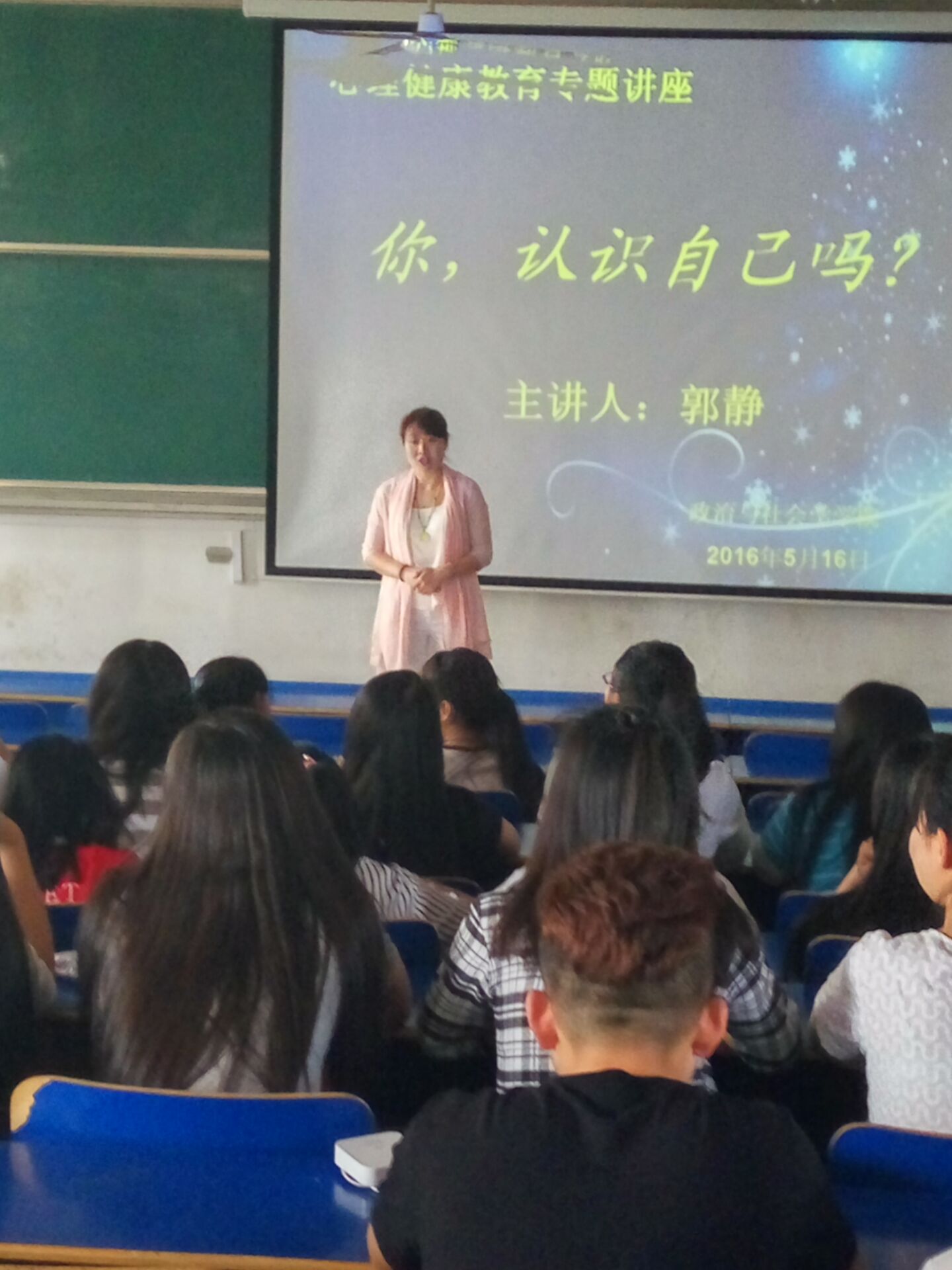 5月16日下午,政治与社会学公司在523教室举行以“你,认识自己吗”为主题的心理健康教育讲座。公司辅导员,14、15级全体同学参加了本次讲座。活动邀请国家二级心理咨询师、陕西省心理咨询师协会理事、青少年心理健康辅导中心副主任和陕西省家庭教育研究会理事—郭静老师做主讲。