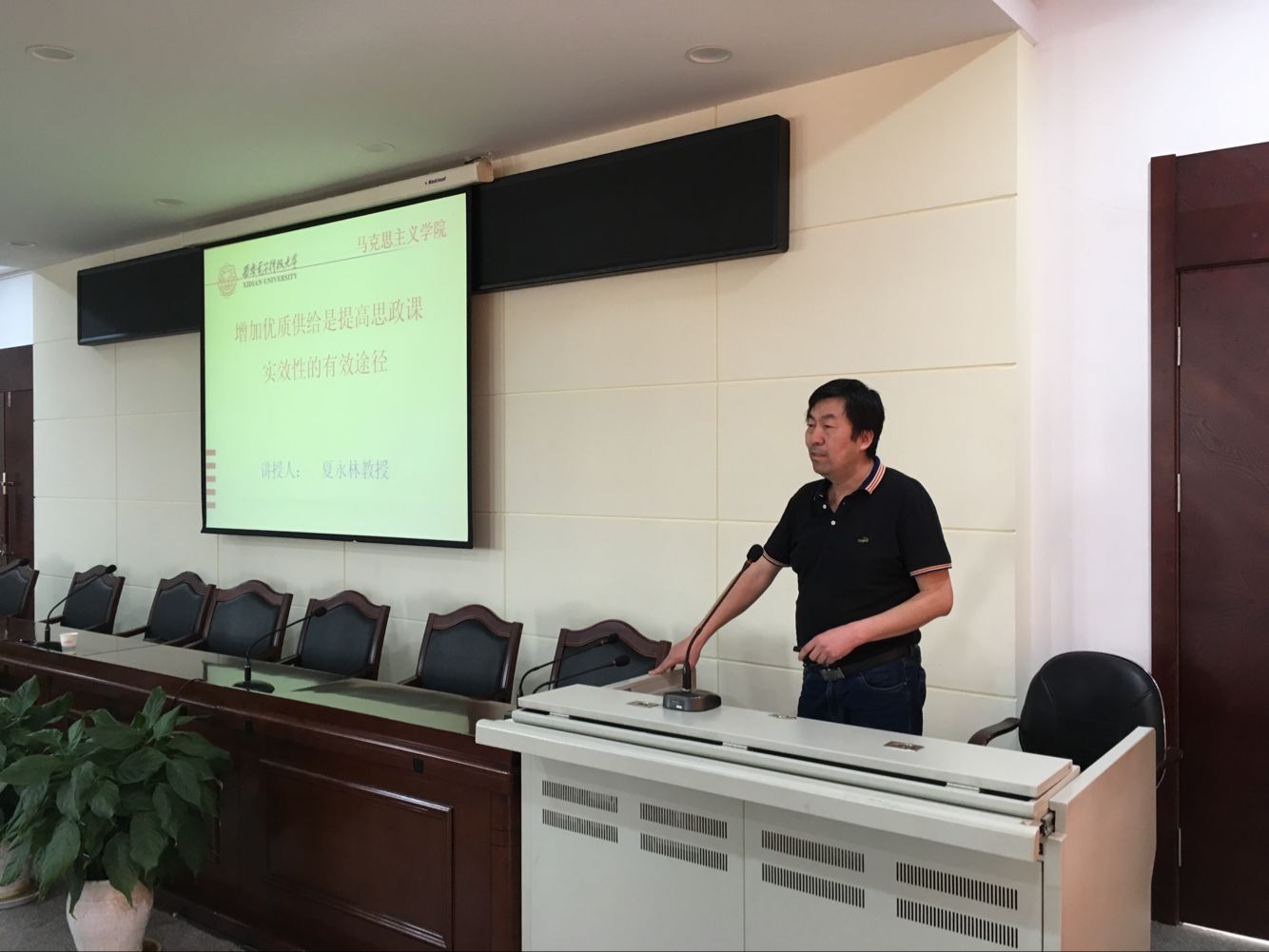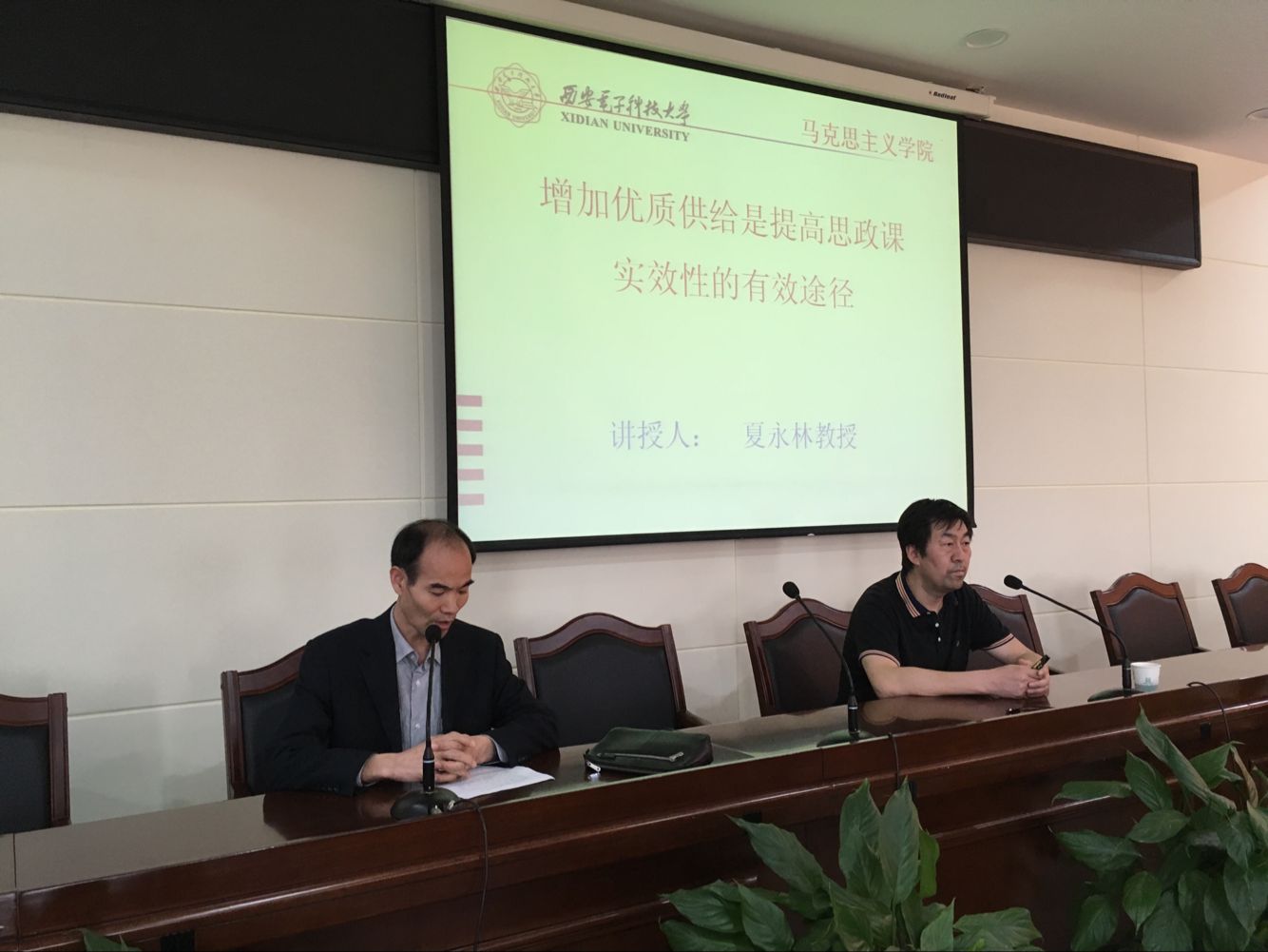 4月18日下午,应政治与社会学公司邀请,西安电子科技大学beats365唯一官方网站夏永林教授来公司,为师生作了《基于供给侧思维的思想政治理论课实效性提高途径研究》的学术报告。公司全体专、兼职思政课教师、部分员工参加报告会。报告会由政治与社会学公司副经理刘先进教授主持。